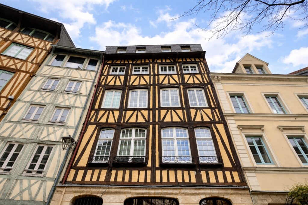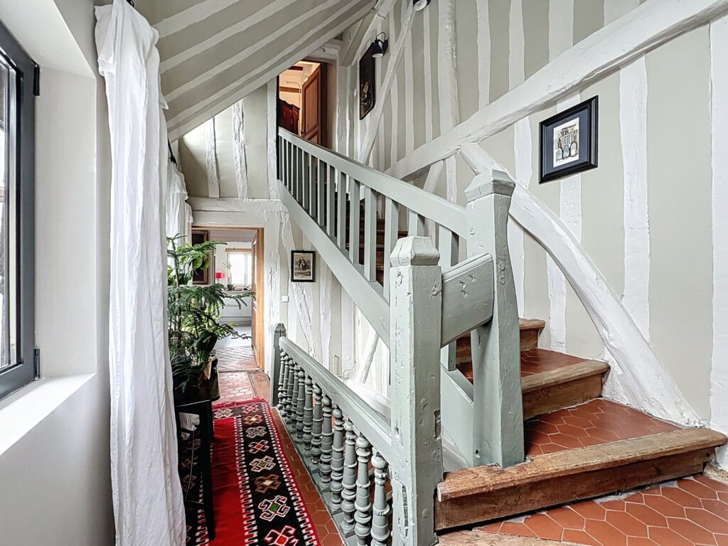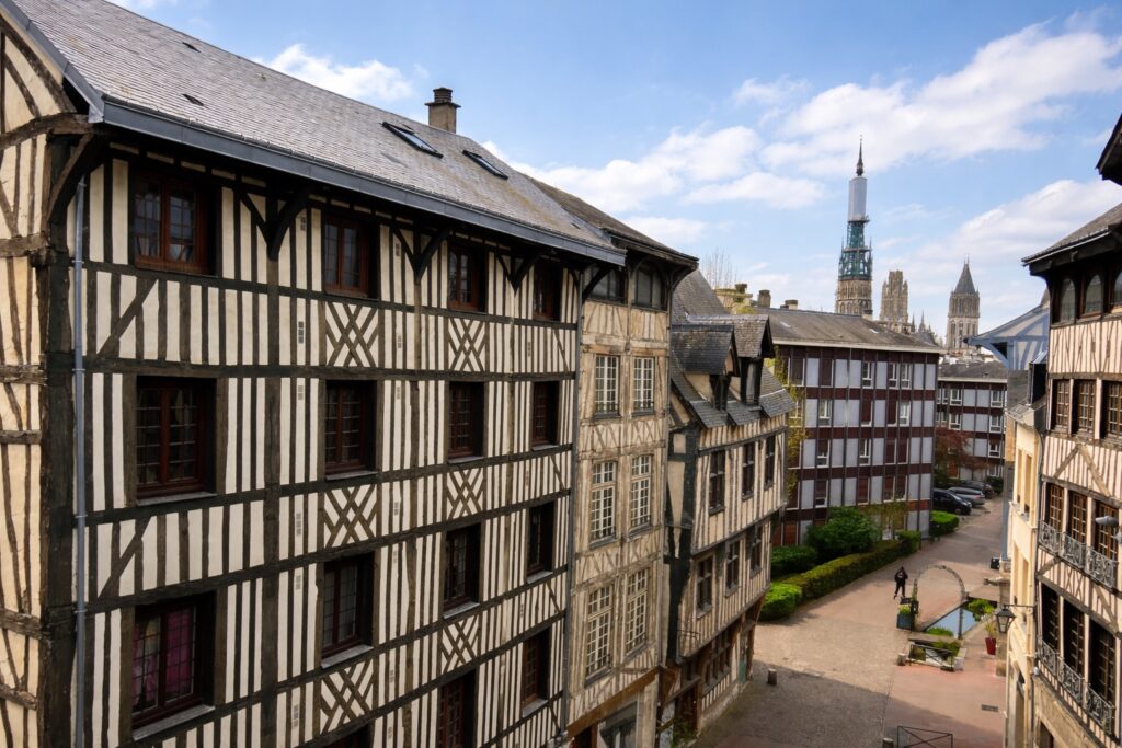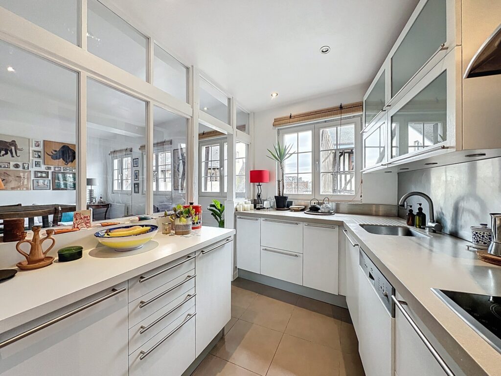 Ce bien offre un séjour traversant de 36 m², lumineux, bénéficiant d’une vue dégagée sur la cathédrale ainsi que sur les façades typiques à colombages, apportant un cadre de vie authentique et recherché. Une cuisine avec verrière, aménagée et équipée, complète cet espace de vie.