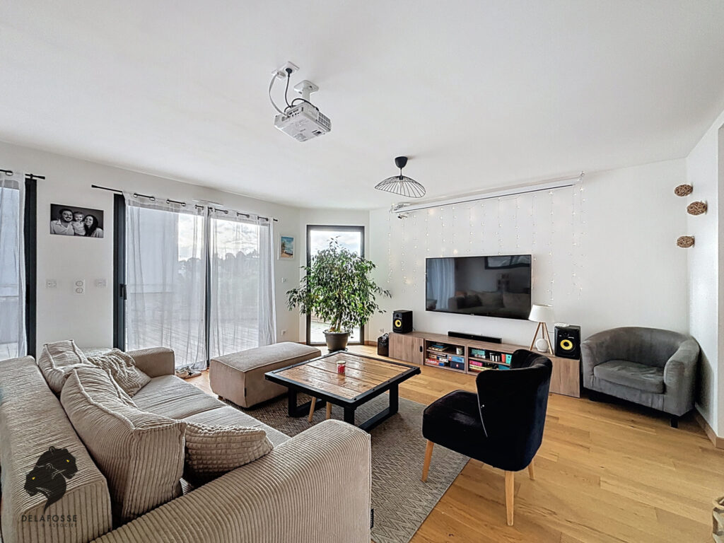 Vous découvrirez une entrée ouvrant sur un bel espace de vie lumineux de 60 m² avec cheminée et cuisine ouverte.