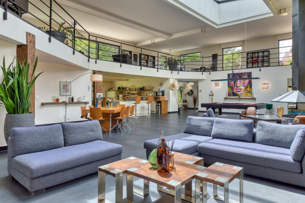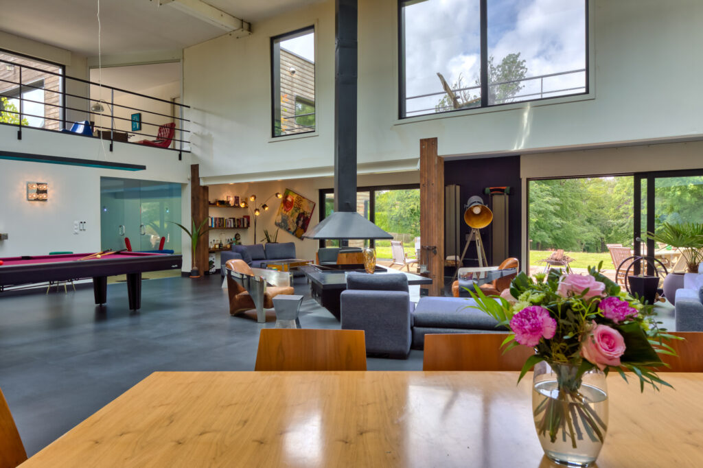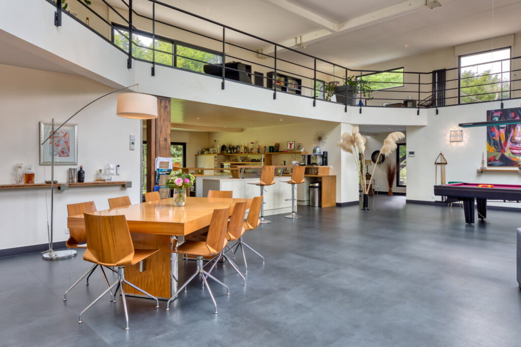Cette demeure singulière dévoile une spectaculaire pièce de réception de 180 m² baignée de lumière, agrémentée d’une cuisine ouverte et d’une cheminée centrale, parfaitement conçue pour l’art de recevoir.