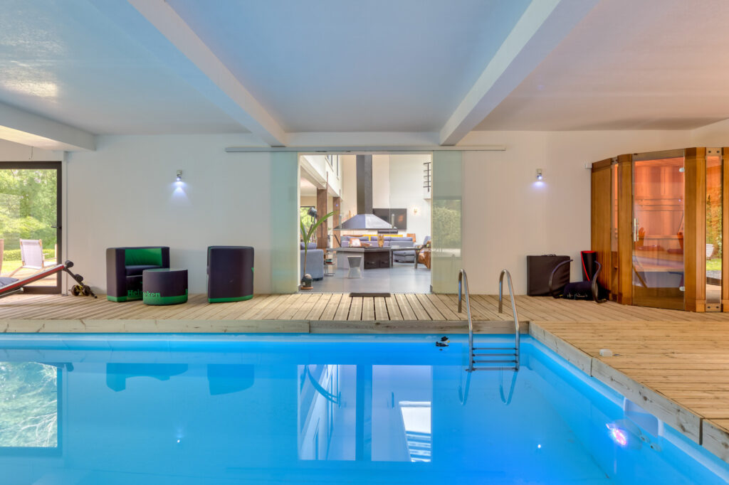 Elle propose également cinq chambres, plusieurs salles d’eau aux prestations soignées, ainsi qu’un espace bien-être d’environ 120 m² comprenant une piscine intérieure et un sauna, offrant un confort de vie rare.