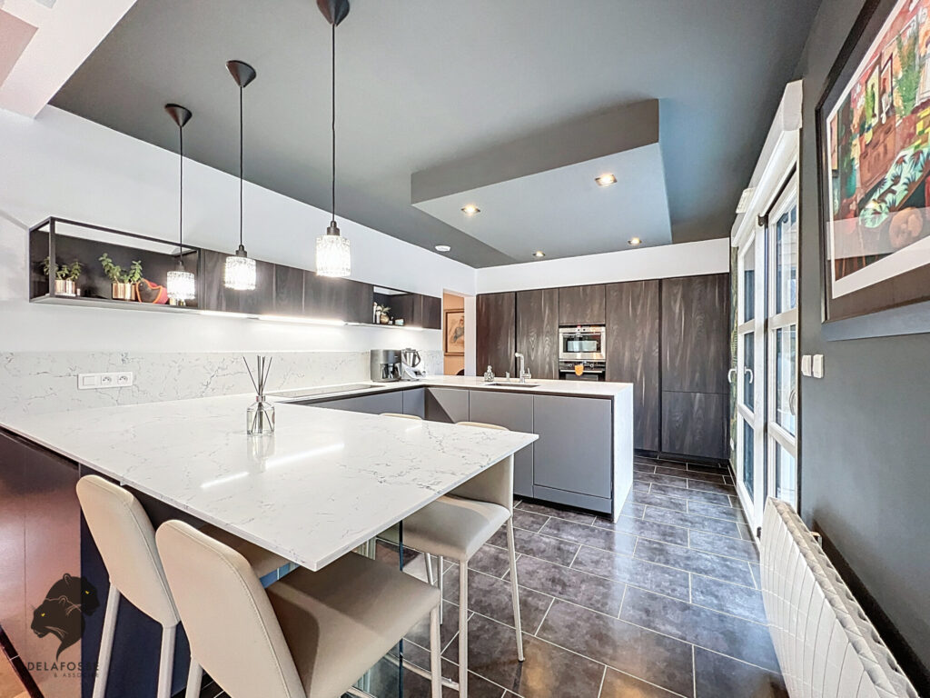 Vous profiterez d’une entrée, d’une grande pièce réception lumineuse de 66 m² avec cuisine ouverte équipée de 16 m², le tout donnant sur terrasse & jardin.